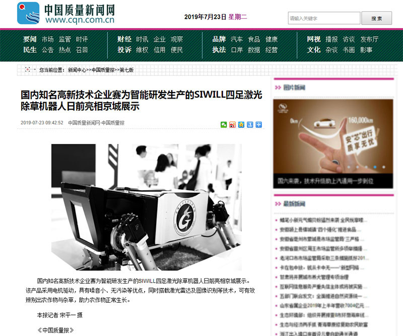 國內知名高新(xin)技術(shu)企業賽(sai)為(wei)智(zhi)能研(yan)發生(sheng)產的SIWILL四足激(ji)光除草機器人日前(qian)亮相(xiang)京城(cheng)展示。該產品(pin)采用電機驅(qu)動,具有噪(zao)音小、無(wu)污染等(deng)優點,同時(shi)搭載激(ji)光雷(lei)達(da)及圖像(xiang)識(shi)別等(deng)技術(shu),可(ke)有效辨別出農(nong)作物與(yu)雜(za)草,助力農(nong)作物正(zheng)常生(sheng)長。本報記者 宋平一 攝 《中國質量報》