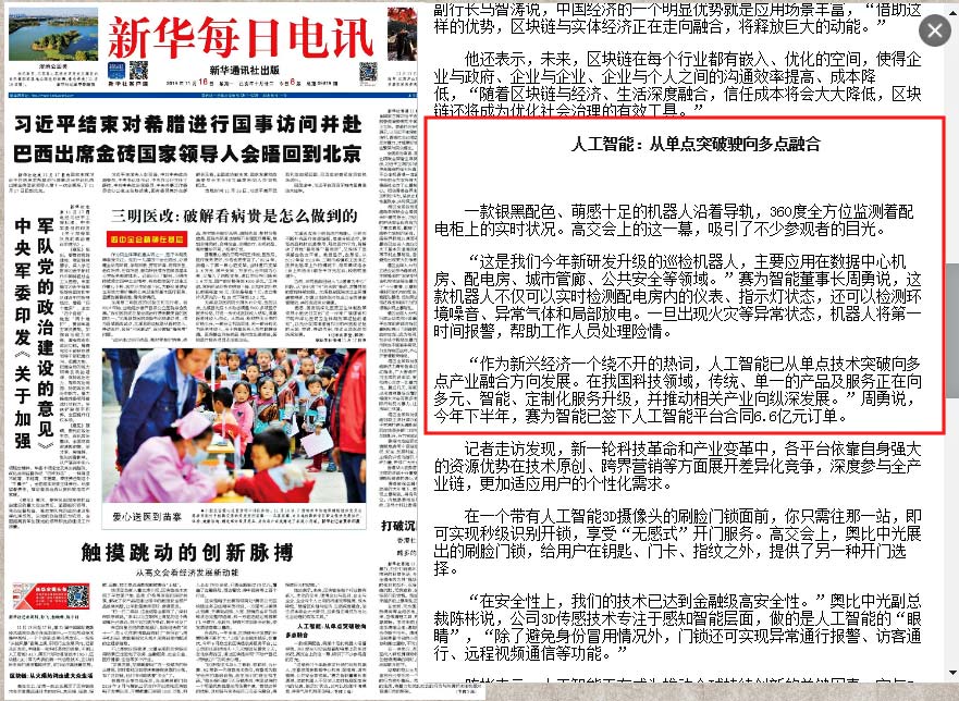 “作(zuo)為(wei)新興經濟一個繞不開的熱詞(ci),人(ren)工智能已(yi)從單(dan)點(dian)(dian)技(ji)術突(tu)破向(xiang)多點(dian)(dian)產(chan)業融合方向(xiang)發展(zhan)。在我(wo)國(guo)科技(ji)領域,傳(chuan)統(tong)、單(dan)一的產(chan)品及服務正在向(xiang)多元、智能、定制化服務升級,并推(tui)動(dong)相關產(chan)業向(xiang)縱深(shen)發展(zhan)。”周勇說(shuo),今年(nian)下半(ban)年(nian),賽為(wei)智能已(yi)簽下人(ren)工智能平(ping)臺合同6.6億元訂單(dan)。