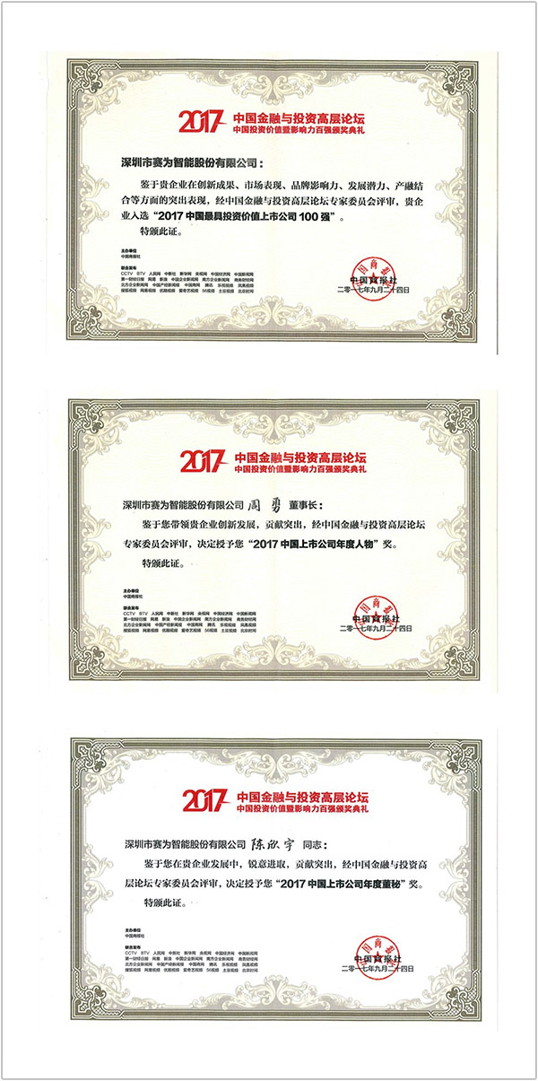 賽為(wei)智能成功(gong)入選最(zui)具投資價值上(shang)市(shi)公(gong)司百強名單,獲(huo)評“2017中(zhong)國(guo)最具(ju)投資價值上(shang)市(shi)公(gong)司100強”,公(gong)司董(dong)(dong)事(shi)長(chang)周勇(yong)先(xian)生當選為“2017中(zhong)國(guo)上(shang)市(shi)公(gong)司年(nian)(nian)度人物”,董(dong)(dong)事(shi)會(hui)秘書(shu)陳欣宇(yu)女士當選“2017中(zhong)國(guo)上(shang)市(shi)公(gong)司年(nian)(nian)度董(dong)(dong)秘”。