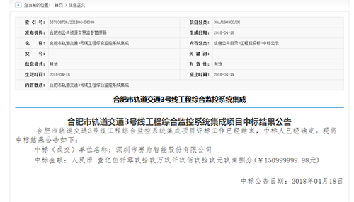 值得一提的是(shi),2018年4月(yue),賽為智能成功中標合(he)肥市軌道(dao)(dao)交通3號線(xian)(xian)工(gong)程綜合(he)監控系統集成項目(mu),中標金額150999999.98元,這也(ye)將是賽為智能在(zai)合(he)肥參加(jia)建(jian)設的第三條軌道(dao)(dao)交通線(xian)(xian)路。此外(wai),截至5月(yue)23日,由賽為智能參加(jia)建(jian)設的合(he)肥軌道(dao)(dao)交通1號線(xian)(xian)、2號線(xian)(xian),累計運送客(ke)流(liu)總(zong)量突破1億人次,各項運行圖兌現率超過99.9%,列(lie)車正點率高達99.92%。